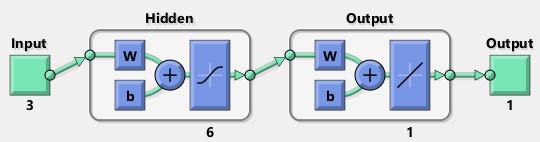 Para el entrenamiento de las redes se adoptó un 15% de los datos para la validación, un 15% para la verificación y el 70% para el entrenamiento. En la capa oculta se utilizan seis neuronas, según se puede observar en la Fig. 2. Este entrenamiento está basado en estudios anteriores [24]. En la Fig. 3 se indica la estructura de la red neuronal finalmente obtenida.