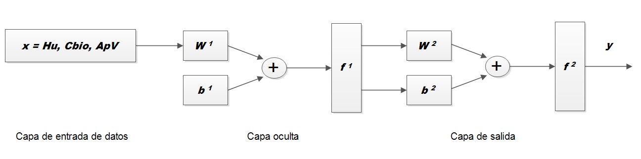 (1)Debido al poco grado de relación analítica que se presentan entre las variables independientes y la variable dependiente, es necesario la utilización de una estructura de modelado que permita determinar, bajo ciertas reglas funcionales, los valores de salida del modelo según los valores de las variables indicadas como entradas [19]. Para ello, se utilizan las técnicas de inteligencia artificial, dentro de las que se destacan las redes neuronales artificiales para la predicción de datos [18], [20].