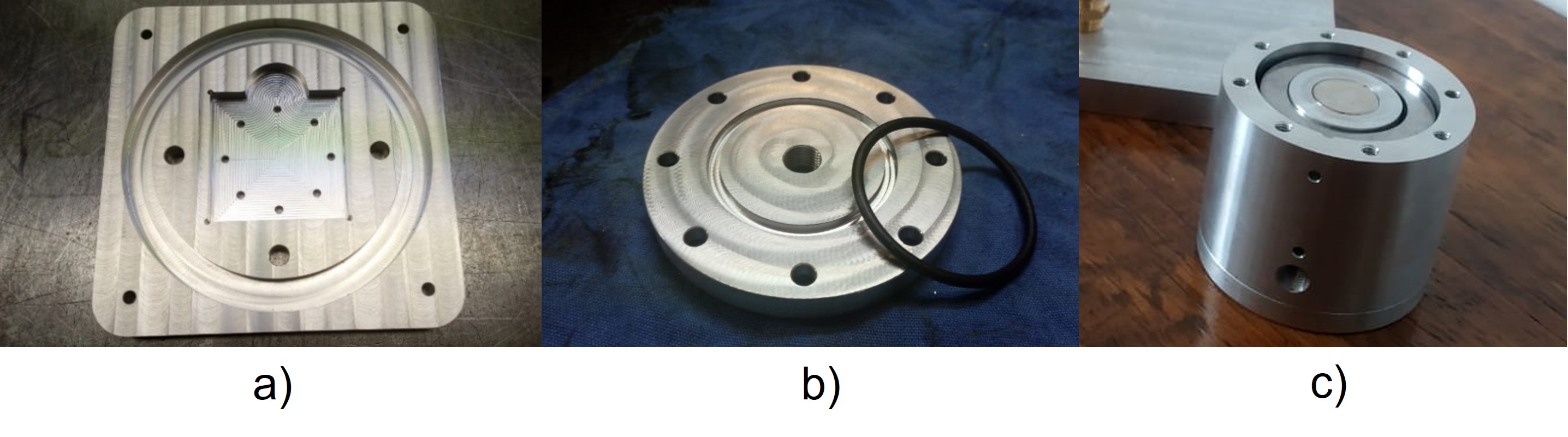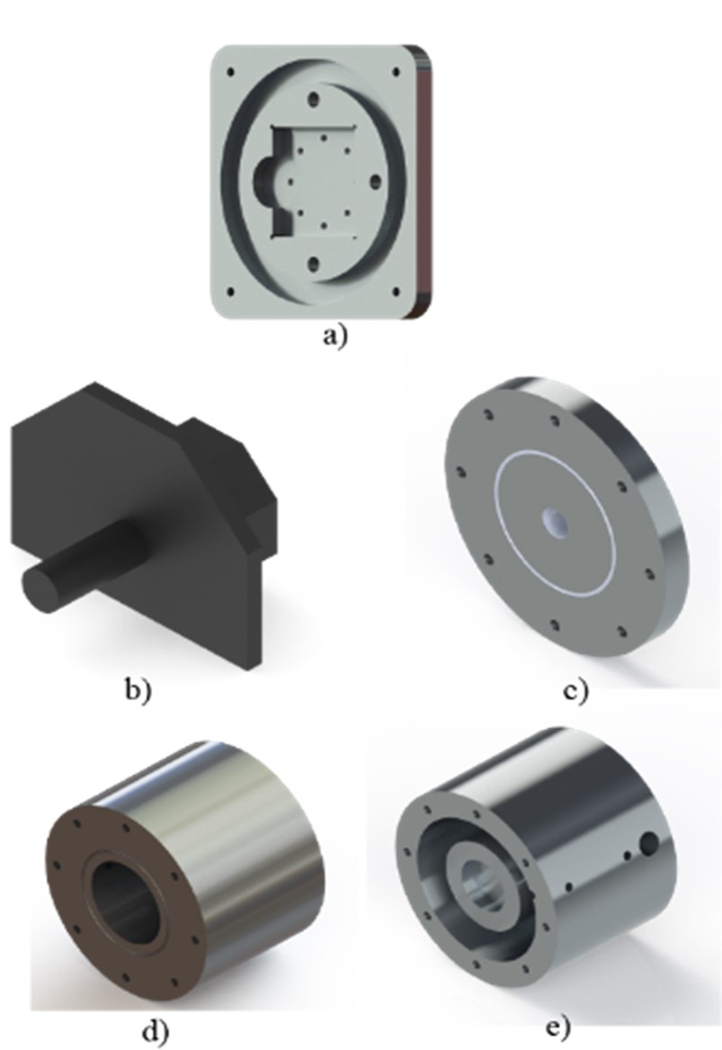 Una vez definidos los elementos requeridos se diseñaron los modelos de tipo CAD de las piezas de este ensamble para posteriormente ser maquinados en un CMV. Para esto fue necesario considerar las dimensiones de una campana de vacío, así como el área de operación del centro de maquinado a utilizar. En total se diseñaron 4 piezas cuyos modelos serían utilizados para su maquinado correspondiente. Estas piezas mostradas en la Fig.2 son la base del ensamble, el sistema de electroimán con enfriamiento (3 piezas) y los coples que serían utilizados para el ensamble de la base sobre perfiles octagonales. Se debe aclarar que las piezas fueron diseñadas para ser maquinadas con procesos de impresión 3D, fresado y torneado. Las piezas se diseñaron para ser maquinadas con impresión 3D, estas fueron realizadas considerando una tolerancia de 1 mm y una geometría que requiriera la menor cantidad de material de soporte posible mientras que las otras piezas fueron realizadas de manera que su maquinado fuera hecho con el menor número de herramientas y cambios de eje, así como el uso de cortadores y tornillos comerciales. Posteriormente con fines expositivos se realizó una modelación de las piezas que no sería maquinadas para poder apreciar las dimensiones requeridas por todo el sistema ensamblado. Las piezas que son sólo con fines expositivos cuentan con las dimensiones originales de sus piezas son: electrodo, imán de neodimio, electroimán, perfiles octagonales, objetivo y campana de vacío. En la Fig. 3 se observa el ensamble de los elementos, así como las vistas normales y en explosión de los dos ensambles (base y sistema de electroimán con enfriamiento).