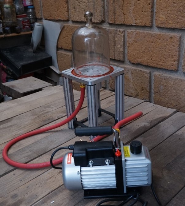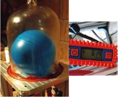 Para comenzar las pruebas de funcionamiento, primero se corroboró que el sistema de vacío funcionara de manera correcta. Para esto, la cámara fue cerrada, la bomba de vacío fue encendida y se midió que el vacío dentro del espacio se estuviera generando. Se consideró a esta prueba como finalizada una vez que la presión interna se encontrará por debajo de los 750 micrones como mínimo. De manera expositiva también se introdujo un pequeño globo de aire a la cámara con el fin de visualizar el cambio de presión dentro de esta. Esta prueba fue considerada exitosa a la marca del primer minuto durante el cual alcanzó una presión de 619 micrones como se muestra en la Fig.12.