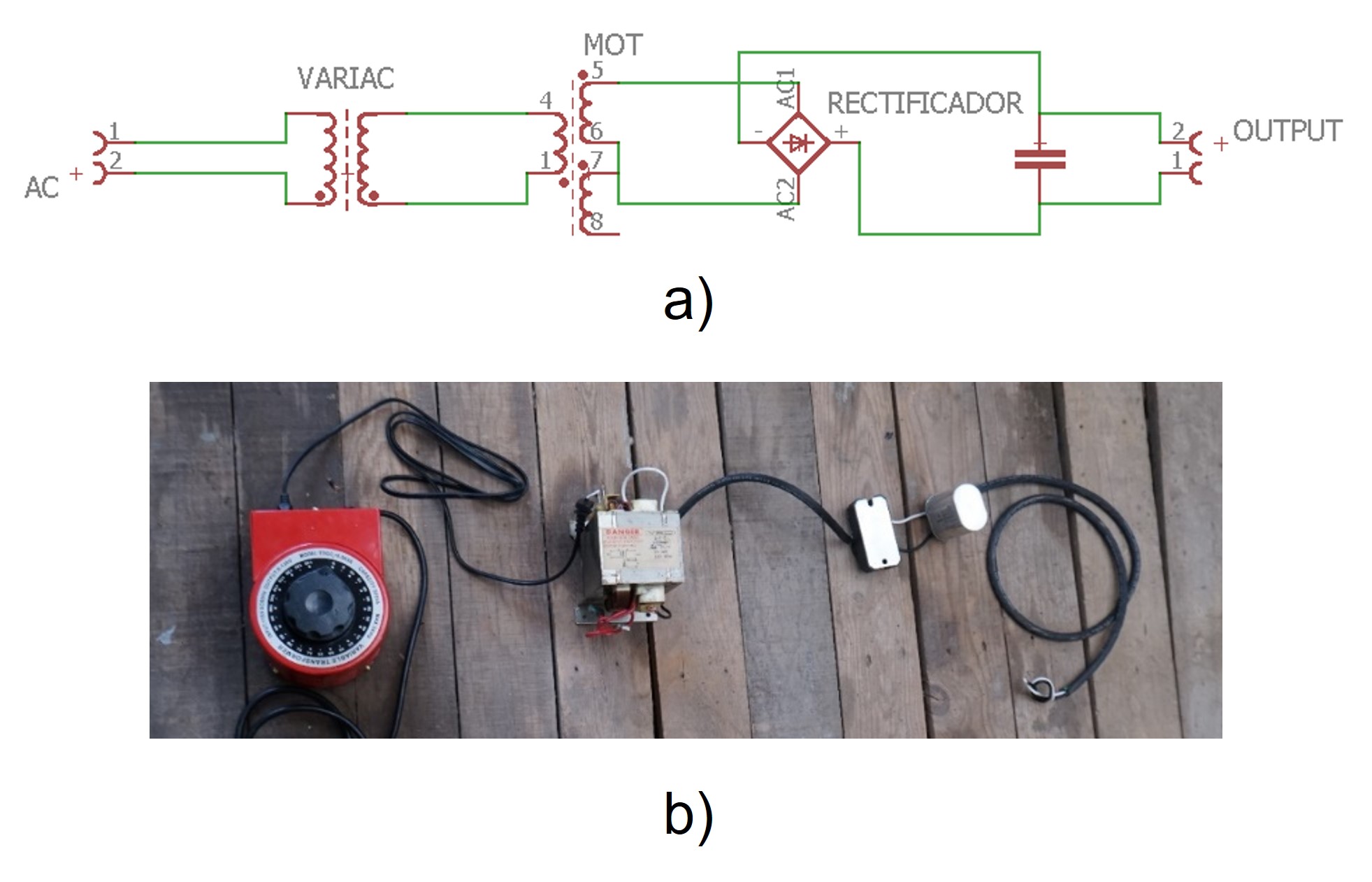 Para lograr este circuito de voltaje variable se utiliza un variac de 0 a 120 volts AC conectado en serie a un MOT con una relación de bobinas de entre 1:18 aproximadamente. Teniendo esta conexión es posible tener un rango de operación de entre 0 y 2200 Volts AC los cuales son convertidos a DC con la ayuda de un puente rectificador de alto voltaje. De este puente salen el cátodo y ánodo que son conectados dentro de la cámara de vacío no sin antes ser filtrados contra picos de voltaje usando un capacitor de alto voltaje conectado en paralelo a las terminales de salida del puente rectificador. Este circuito se puede observar en la Fig. 9.