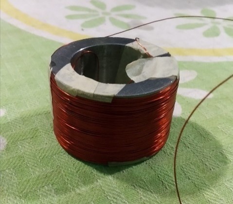 Para mantener la forma toroidal del campo es necesario igualar a la fuerza de atracción del electroimán con la fuerza magnética del imán permanente; el cual se conoce es de 55 Teslas. Usando las leyes de Ampere se calculó el número de vueltas necesarias para obtener esta cifra considerando un núcleo de hierro 1026 de 34 mm y .22 y un amperio de corriente. Es así como el número de vueltas resultó en 240. Una vez embobinado el núcleo mostrado en la Fig. 10 se desarrolló su sistema de enfriamiento.