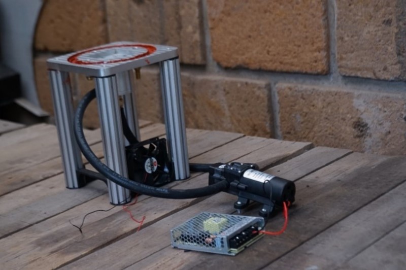 Para esto se debe considerar un sistema de enfriamiento que garantice la integridad magnética del imán permanente debido a que su temperatura de operación no debe rebasar los 150°C. Este sistema se puede observar en los CAD de la Fig. 2 en la base de la pieza donde se ensambla el sistema de atracción magnética. Para esto se estará utilizando un sistema de enfriamiento de tipo cascada el cual inunda al núcleo de la pieza desde su base con líquido y lo fuga por la cara lateral de este manteniendo un flujo constante con la ayuda de una bomba de agua de 12 V. Además de esto se cuenta con 2 ventiladores de 12 volts ubicados de manera paralela al sistema con el fin de mantener un flujo constante de aire externamente. Todo este sistema es alimentado por una fuente conmutada de 12 Volts y en su totalidad requiere de 8.2 amperios para funcionar. Este sistema conectado se puede apreciar en la Fig. 11.