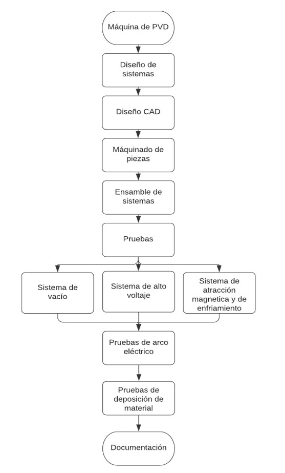 Dentro del desarrollo de este trabajo se abordó el proceso de pulverización por transferencia de momento. Es necesario comprender que para que este el sistema funcione, se necesita de tres elementos que garanticen la generación y focalización del plasma en un ambiente controlado, estos son: vacío de por lo menos 750 micrones, alto voltaje y un campo magnético que guíe al plasma hacia el objetivo a pulverizar [4], [6]. El proceso para la realización de este trabajo se observa en la Fig. 1.