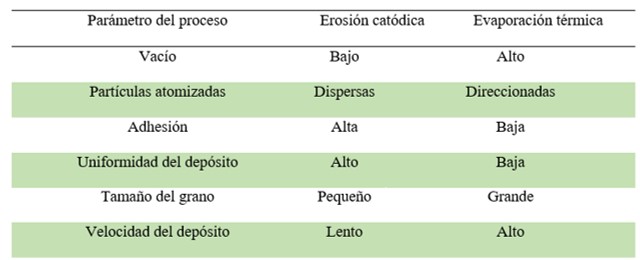 Al realizar procesos de PVD existen dos ramas que lo involucran, la deposición por erosión catódica y por evaporación térmica. Ambas son realizadas bajo un diferente principio físico y tienen diferentes resultados. En la Tabla 1[7], se encuentra una comparación que muestra los diferentes parámetros técnicos en cada uno de estos métodos.