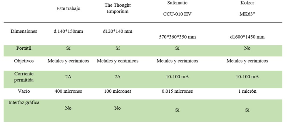 Con esto se puede saber que los métodos de erosión catódica generan depósitos más densos y no son dependiente del tipo de objetivo utilizado por lo que se pueden usar objetivos metálicos o cerámicos sin importar su temperatura de evaporación. De igual manera la adhesión de estos depósitos es mayor por lo que las propiedades superficiales brindadas a los sustratos son diferentes a aquellas conseguidas con el método de evaporación. Una vez analizadas las ventajas y desventajas de ambos métodos debemos también se debe de realizar una comparación con las máquinas de PVD existentes en el mercado. Para este trabajo vamos a comparar a la máquina realizada en este documento contra aquellas tanto creadas con fines industriales, así como aquellas más pequeñas creadas con fines educativos o para su uso en laboratorios. Para esto vamos a usar a las máquinas de Kolzer [8], Safematic [9] y aquella realizada por el colectivo de investigación The Thought Emporium[10]. Esta comparación se encuentra en la Tabla 2.