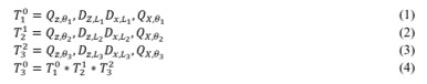Luego se realizan las matrices de transformación, teniendo presente siempre que primero se hace rotación en z, desplazamiento en z, desplazamiento en x y rotación en x, en caso de que se necesite un movimiento más para que coincida, significa que quedaron mal ubicados los sistemas de coordenadas [22]. Se puede observar que longitudes para el caso del robot cartesiano son variables.
