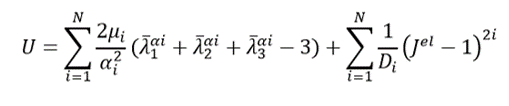 (1)Donde U es la energía de deformación expresada en la relación de volumen y la invariante de deformación.