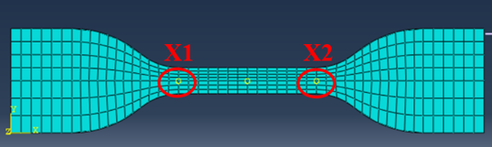 En el análisis de la deformación, se seleccionaron dos puntos dentro de la probeta los cuales se llamaron X1 y X2, como se observa en la Fig. 9. Los puntos seleccionados se encuentran a una distancia inicial dentro de la probeta que servirán como referencia para obtener el desplazamiento entre los puntos y obtener como resultado la deformación que existe dentro del cuerpo.