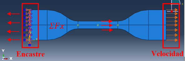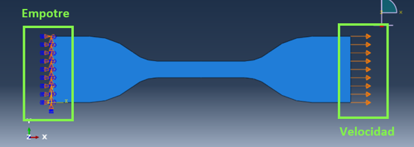 El siguiente paso en la simulación fue colocar las condiciones de frontera de la probeta. De acuerdo con la norma ASTM D-412, un lado debe tener un empotre fijo y el otro será con movimiento, es decir tendrá una velocidad de desplazamiento como se muestra en la Fig. 7.