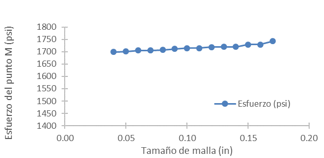 Como se observa en la Tabla 2, los resultados de esfuerzo en el punto M fueron definidos todos en un tiempo de prueba de 7.22 segundos para cada tamaño de malla. El rango de tamaño de malla fue de 0.17 hasta 0.04 pulgadas. Para observar la convergencia de la malla, estos resultados se graficaron como se muestran en la Fig. 12.