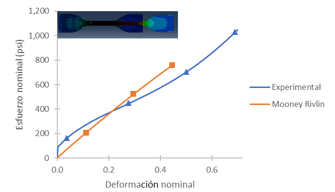 Como se observa en la Fig. 13, con el modelo seleccionado no se logró llegar a una convergencia en el tiempo establecido, la prueba terminó en el segundo 5.15 de acuerdo con los resultados obtenidos en software. La comparación entre los resultados experimentales y los resultados del modelo Mooney Rivlin tienen una mínima similitud entre las líneas de tendencia, teniendo un valor de esfuerzo similares en la deformación nominal 0.23. De acuerdo con los resultados para una deformación nominal del 0.4 se tiene una diferencia del 17% con respecto al ensayo experimental, esto debido al comportamiento lineal del modelo Mooney Rivlin.