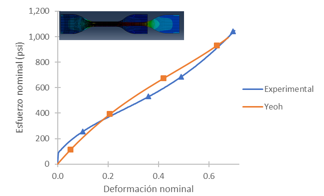 Para el modelo Yeoh se utilizaron los mismos parámetros de tiempo y malla, esto con el fin de obtener la similitud en los resultados. En la Fig. 14 se muestran los resultados con la comparativa de los resultados experimentales.