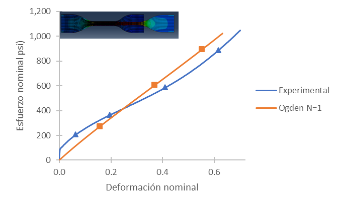 · Para el modelo Polinomial de orden 2, se observó un comportamiento similar al experimental para valores de deformación nominal del 0.5 y se obtiene una diferencia del 5% con un modelo polinomial de segundo orden con respecto a los valores experimentales, pero conforme incrementa la deformación las curvas se desfasan incrementando la diferencia porcentual entre los valores de esfuerzos.