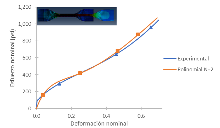 Los resultados indican que el modelo polinomial tiene un comportamiento similar la curva experimental. Para una deformación nominal del 0.5 se observa que hay una diferencia mínima del 5% pero conforme se incremente el valor de deformación las curvas se desfasan.