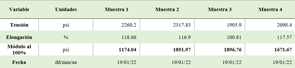 Los resultados de las propiedades mecánicas del material se realizaron de acuerdo con la norma ASTM D-412. La metodología de la norma marca que las muestras se tienen que realizar de tipo corbatín y se ingresaron al tensiómetro para obtener las lecturas de elongación y módulo de elasticidad. Los resultados obtenidos se muestran en la Tabla 1.