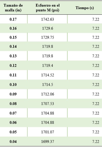Como se observa en la Fig. 12, el esfuerzo en el punto M converge a partir del tamaño 0.09 in hasta el tamaño 0.14 in, donde se muestran tres puntos consecutivos rectos por lo tanto para la selección del tamaño de malla fue el más pequeño en esos tres puntos el cual fue 0.12 in. El tamaño seleccionado con respecto al menor valor tiene una diferencia de 20 psi y con respecto al mayor tiene una diferencia de 23 psi. Lo cual demostró que el rango seleccionado de la malla no tiene una variación elevada con respecto a los rangos seleccionados.