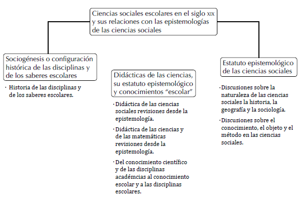 En este sentido, el problema de investigación toma distancia de estos postulados y, como se ha venido señalando, se ubica en un lugar distinto de análisis, desde donde las ciencias sociales escolares se conciben como el saber producido en y para la escuela, que se convierte en materia de enseñanza, y el saber que se produce en un régimen amplio del discurso sobre la enseñanza y lo que se debe enseñar.