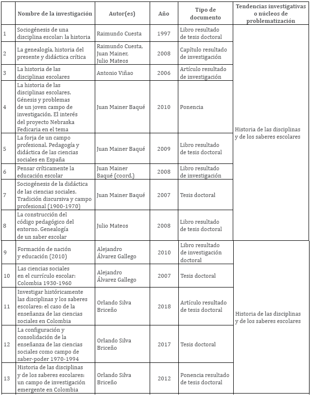 Esta dispersión temática permite justificar la singularidad del objeto de estudio sustentada en tres tendencias investigativas que marcan la organización de las fuentes en esta revisión bibliográfica como se ha venido mencionando (véase la figura 1). De esta manera, la búsqueda de la producción académica sobre el tema se focalizó tanto en la configuración de las disciplinas escolares como en el asunto epistemológico de las disciplinas académicas de referencia y de la didáctica por considerarla, en los mismos documentos trabajados, la disciplina que tiene como objeto de estudio la enseñanza. Esto permitió identificar los nodos de los dos elementos centrales del problema de investigación: las ciencias sociales escolares y las epistemologías de las ciencias sociales. En la tabla 1 se compendian los distintos trabajos localizados en las tres tendencias investigativas o núcleos de problematización, se describe el nombre de cada una, los autores y las autoras de referencia, el año de publicación y el tipo de documento
