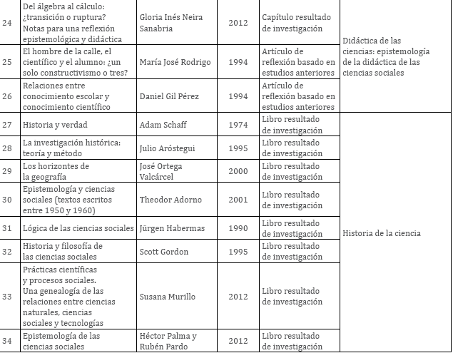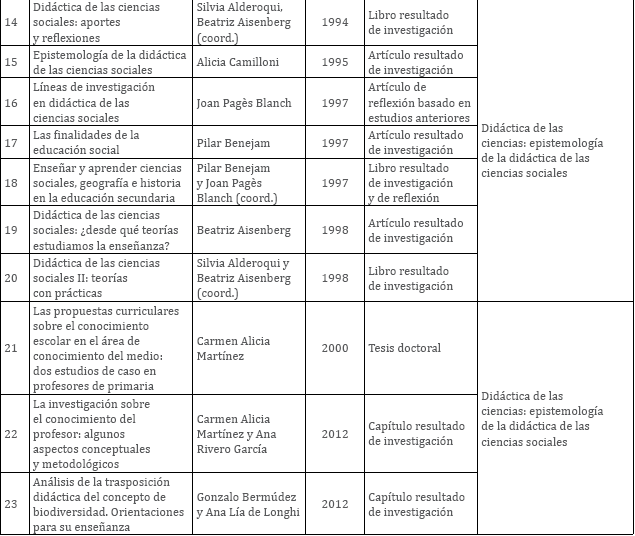 En esta revisión bibliográfica se advierte que los países con mayor producción sobre la epistemología de la didáctica de las ciencias sociales son Argentina y España, en cabeza de investigaciones o programas liderados principalmente por académicas, con una abundante producción en el decenio de 1990. Por tanto, se toman las publicaciones que abordan esa relación directa entre la didáctica y la epistemología en el ámbito social.