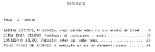 Após esta rápida sistematização, elaborou-se um segundo movimento de organização, buscando pelos sumários individuais de cada uma das Revistas. Este amplo mapeamento teve como objetivo verificar se os sumários se mantiveram iguais ao longo dos vinte anos analisados. Assim, se iniciou um aprofundamento em edições que seriam mais interessantes para a análise proposta. Depois de verificar estes aspectos, foi elaborado um quadro em que são descritos estes sumários, destacando mudanças e regularidades no período em questão. Da mesma forma, após esta análise, foi eleita a seção Ideias e Debates como o foco principal de investigação. Para esta delimitação, a principal justificativa foi de que nesta seção encontravam-se os artigos dos principais intelectuais da educação à época, muitos deles com grande envolvimento na causa da renovação educacional no país. Cada edição da Revista apresentava de quatro a seis artigos na seção Ideias e Debates. Tais artigos, como ilustra o quadro a seguir, foram escritos por intelectuais de áreas variadas e buscavam refletir sobre experiências brasileiras e estrangeiras, bem como sobre tópicos teóricos variados: