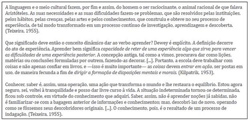Apesar destes apontamentos, ao explorar as inspirações teóricas desta segunda face do escolanovismo no Brasil (Cunha, 2000), fortemente ancoradas em John Dewey, percebe-se que ele "não desenvolve explicitamente um conceito de aprendizagem, mas seu conceito de experiência educativa se confunde com o de aprendizagem e este, por sua vez, com os conceitos de crescimento, desenvolvimento e adaptação" (Noguera-Ramirez, 2011, p. 248). Assim, nesta grade interpretativa, a aprendizagem é uma ferramenta para alcançar outros objetivos. Portanto, a aprendizagem como experiência pode ser entendida como um tipo de aperfeiçoamento constante das conduções individuais, implicando uma postura educativa frente à vida, como exemplificam os excertos seguintes.