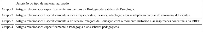 Assim, os artigos selecionados foram mapeados, buscando questões relativas à aprendizagem, ao aprender e ao ensinar, por exemplo. Depois de um exercício recorrente de escolhas e descartes, passaram a ser destacadas as recorrências nos materiais analisados, visando a composição das categorias analíticas. Posteriormente, tais combinações resultariam em três grupos distintos: psico-biológico (aprendizagem como aprimoramento individual); sociológico (aprendizagem como ajustamento social) e filosófico (aprendizagem como experiência). Tais grupos, ao final, encaminhariam as análises, que seguem delineadas a seguir.