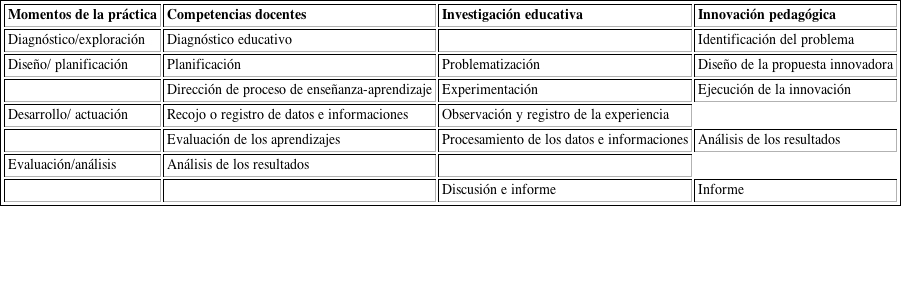 La práctica en la formación de la carrera docente define la indagación educativa como investigación-acción por cuanto resulta simultáneamente la prueba o el ensayo de una innovación pedagógica, cuyo estudio trata acerca de la intervención pedagógica. Este es un postulado que reclaman todas las experiencias acerca de la práctica docente, como investigación e innovación pedagógica; así lo intuye Ángel Pérez, cuando afirma que la práctica es "quien marca el sentido y la naturaleza de las prácticas es la escuela, nuestro modelo pedagógico, es acompañar, ayudar y experimentar. Vamos a acompañar, a ayudar y a experimentar" (Pérez, 2015, s/p.) porque la "práctica" no es solo la puesta en hechos de lo aprendido sino un proceso de aprendizaje real y necesario, de aprendizaje verdaderamente significativo durante la formación docente. La práctica somete a "prueba de fuego" el desarrollo de las competencias profesionales pensados en teoría, debe estar ligada a la investigación educativa y a la innovación pedagógica, de lo contrario: