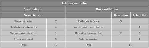 Los estudios no cuantitativos (11) son de cuatro tipos: reflexión teórica, revisión documental, investigación cualitativa y sistematización. Cuatro toman como objeto la retención o prevención de la deserción (Cardoso-Ortiz, 2011; Pineda-Báez, Pedraza-Ortiz y Moreno, 2011; Suárez-Montes y Díaz-Subieta, 2015; Torres, 2012) y los siete restantes, la deserción.