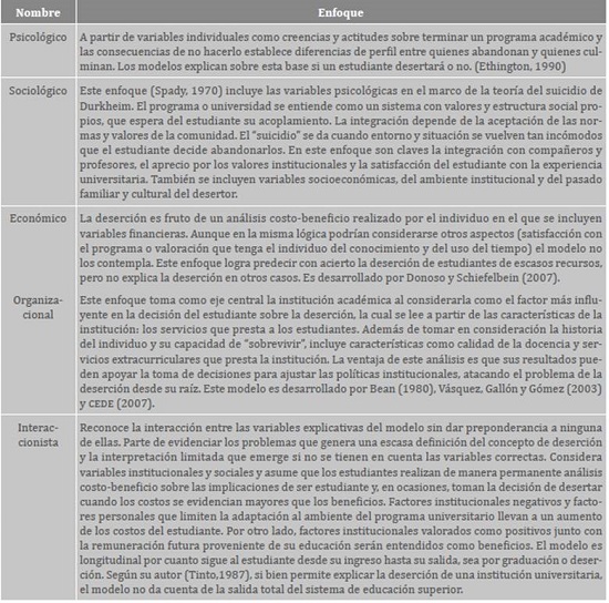 Dentro de los estudios estadísticos, algunos establecen cadenas de causalidad que dan cuenta de "factores asociados", "de riesgo" o "determinantes" de la deserción y modelan sus dinámicas en un contexto específico. Donoso y Schiefelbein (2007, citados en Montes et al., 2010) clasifican los abordajes de la deserción en cinco, a partir de las disciplinas en las que se desarrollan: psicológico, sociológico, económico, organizacional e interaccionista. La tabla 2 presenta un resumen de los énfasis particulares de cada enfoque.