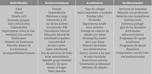 Los estudios explicativos toman en consideración cuatro aspectos como determinantes de la deserción: individuales, académicos, socioeconómicos e institucionales. La tabla 3 presenta un resumen de las variables encontradas en cada uno de ellos.