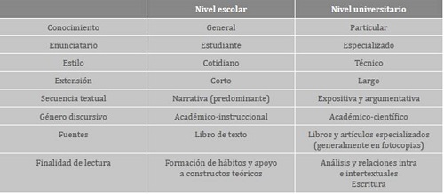Desde una perspectiva cualitativa, el estudio sobre los efectos de la alfabetización académica en la deserción (Olave-Arias et al., 2013) argumenta de forma convincente sobre las diferencias entre estilos de aprendizaje y argumentación en la educación media y la superior. Como lo muestra la tabla 4, se evidencian contrastes fundamentales entre textos, finalidades, tipos de ejercicio y habilidades requeridas en los procesos lecto-escriturales. Contrastes, para los cuales, en muchos casos, las mismas universidades omiten preparar o lo hacen de manera insuficiente, por lo que estas competencias básicas pueden transformarse en fuente de frustración y posterior deserción.