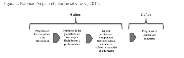 Dadas las circunstancias del Estatuto de Profesionalización Docente, en las universidades que no tenían facultades de educación se ha ido configurando un modelo alternativo en la formación inicial de los docentes: cuatro años en una carrera disciplinar o profesional más dos años de una maestría en educación (4 + 2, se llama el modelo); este es el caso de la Universidad Nacional de Colombia. Hacia la primera década del siglo xxi se fundó el Instituto de Investigación en Educación (2001) en la Facultad de Ciencias Humanas, en respuesta a lo que demanda la Ley 115 (dado el alto número de solicitudes de consultorías en educación y de programas de actualización docente); este instituto programará cursos en educación electivos (cursos de contexto) y pasantías para estudiantes de todas las carreras interesados en el tema de la educación, con lo que se da lugar a un plan alternativo para la formación de los futuros docentes, sobre todo para la Educación Secundaria, Media y Superior: dedicar el 20 %, que corresponde al componente flexible de las carreras, a la formación en pedagogía y en educación paralelamente a la formación en las disciplinas y las profesiones; luego de graduados y tras reconocer la complejidad y los retos en el campo de la educación, los profesionales deciden si continúan o si definen otra ruta; quienes continúan enlazan el pregrado con el posgrado a través de la Maestría en Educación, fundada también en el Instituto en 2007. Así se concreta un modelo alternativo de formación de docentes; sin embargo, constituye un obstáculo el valor de las matrículas[9] de los posgrados[10] y por eso son muy pocos los que logran este enlace; el modelo se rompe por problemas económicos.