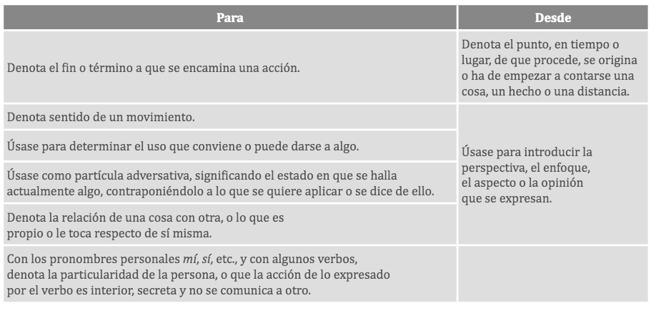 Para dar respuesta a nuestro interrogante, usamos dos preposiciones: para y desde. En el Diccionario de la lengua española de la Real Academia de la Lengua se presentan los siguientes significados de estas preposiciones: