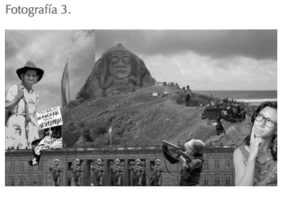 La foto recoge varios parajes de nuestro país. Se encuentra la Chaquira de San Agustín, los caminos del Cauca minados por el ejército, las murallas de Cartagena. Son espacios que he pisado con mis pies, que me han dejado el recuerdo vivo del territorio, sobre todo, un recuerdo vivo de resistencia. Colombia no solo es pasión, pasión en reinados de belleza y fútbol, no es solo cocaína, armas y sexo. Es también territorio, caminos forjados con pala y pica a manos de los campesinos, los indígenas, los afros, cultivadores de papa, yuca y cultura de resistencia. Son estos caminos llenos de riquezas de recursos naturales, que quieren ser expropiados con terror. El Gobierno nacional expropia el territorio que es de los colombianos y las colombianas para ser dado a multinacionales y extranjeros, a cambio nos quedamos con el desplazamiento, el hambre, la injusticia. (Daniela, 18 años, séptimo semestre)