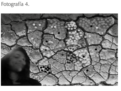 Colombia ha significado desde sus inicios un país pluriétnico, multicultural gracias a la diversidad de lenguas, paisajes y gentes, en sus maneras de actuar, en su formación de carácter, acciones y expresiones en el mundo social […] En esta foto podemos encontrar una representación del mapa de Colombia, en donde se vislumbra una serie de puntos de muchos colores que serían las personas que viven en ese lugar, con sus múltiples personalidades, caracteres y acciones. Eso significa cada color, en donde en cada lugar hay unas expresiones comunes, pero también existe la diferencia de personas que provienen de otro lugares, con tradiciones ancestrales y cósmicas, posicionando así su lugar, el del nacimiento de la madre tierra. Hay tres planos, en el primero me encuentro yo con un color y una forma propia de ser y actuar, según mi familia, mis grupos de pares y el territorio donde me encuentro. En segundo plano se encontraría el bosquejo abstracto con sus imperfecciones, la representación simbólica de Colombia y, finalmente, el tercer plano sería la tierra agrietada por efectos de la naturaleza, pero, a su vez, por acciones del hombre y su habitar en el mundo. (Jenny, 18 años, séptimo semestre)