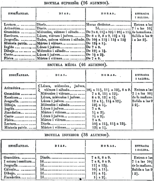 Para el caso de las escuelas elementales, (Guarín, 1876), se fijaron cinco medias horas por semana. Suficientes, pues en la clase objetiva maestro debía "dibujar siempre el objeto tratado, i de este modo los niños se ejercitan bastante en tan importante i dificil arte" (p. 249). Para la clase de dibujo en una escuela elemental, el pénsum, los contenidos de enseñanza se relacionaban para el año primero con: