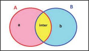 En la figura 1, a representa el campo del Otro; a saber, el conjunto de los significantes de la lengua materna de la cual toma sus significantes el sujeto b. Si este es todavía infans, sin palabra, admitiremos que b toma los mismos significantes que formula a, representados por la zona amarilla del gráfico. Lo común entre a y b, el inter en la figura, estaría dado por los mismos significantes: la reunión de los dos conjuntos, que define la alienación lacaniana.
