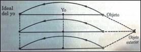En la figura 3, propuesta por Freud, las líneas horizontales representan a cada uno de los miembros de la masa, que en su historia particular se ha construido una imagen de sí, un yo, así como su Ideal del yo y erigido un objeto libidinal propio. Como muestran las líneas paralelas del gráfico, cada miembro está desligado de los otros en la masa; pero, el fenómeno libidinal, la masificación, ocurre porque cada uno proyecta en un objeto exterior (líder, objeto, pantalla, televisión) su propio objeto y (como indican las flechas de sentido retrógrado) lo erige en su propio Ideal del yo, mientras asume una identificación imaginaria (líneas punteadas entre cada yo) con los demás miembros del colectivo.