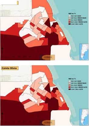 Cada uno de los radios censales está compuesto por cierto porcentaje de hogares con NBI. En función de ello, el conjunto de radios censales de la localidad se ha agrupado en cinco quintiles cuyos polos van desde NBI bajas, es decir donde hay menos cantidad de hogares con pobreza, a NBI altas o con mayor cantidad de hogares en situación de pobreza. Estos datos fueron georreferenciados mediante sistemas de información geográfica (SIG), que permitieron adoptar una perspectiva urbana de la desigualdad social y de la educación secundaria en Caleta Olivia.
