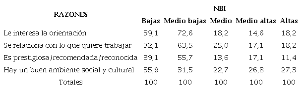 Los estudiantes que asisten a la escuela por motivos asociados a la orientación o al trabajo son mayormente los de escuelas ubicadas en zonas con menores NBI (NBI bajas: 39,1 % y 32,1 %, respectivamente; NBI medio bajas: 72,6 % y 63,5 %, respectivamente). En cambio, si bien el porcentaje de los estudiantes que asisten a escuelas con mayores necesidades (NBI medio altas y altas) es menor, son muchos en proporción quienes relacionan su asistencia a la escuela al interés por la orientación y la relación con el trabajo (NBI medio altas: 14, 6 % y 17,1 %, respectivamente; NBI altas: 18,2 % en ambas variables). La mayoría de los estudiantes que asisten a las escuelas ubicadas en emplazamientos con altos niveles de pobreza no han elegido su escuela principalmente por la orientación que ofrece o por su relación con el mundo del trabajo. Se podría pensar que ellos y ellas en un primer momento no la eligen, pero "cuando ya están allí sí lo hacen por aquello que la escuela es y por aquello que allí viven" (Langer, 2013, p. 379). Al revés de lo que sucede con sus pares que concurren a escuelas con NBI bajas ya que en mayor medida asisten porque hay buen ambiente social y cultural, porque es prestigiosa, recomendada o reconocida.
