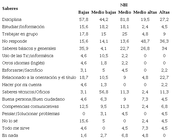 La tabla 2 también expresa algunas particularidades con respecto a los saberes útiles para el mundo del trabajo, como obtener mayor información o saber trabajar en grupo, que se suceden mayormente entre los estudiantes que asisten a escuelas ubicadas en NBI bajas (15,6 % y 17,8 %, respectivamente), NBI medio bajas (18,2 % y 15 %, respectivamente) y NBI medio (18,1 % y 25 %, respectivamente). En contraposición, los porcentajes disminuyen al considerar las miradas de quienes van a escuelas ubicadas en NBI medio altas (2,4 % y 4,8 %, respectivamente) y NBI altas (4,5 % y 9 %, respectivamente). Estos saberes están relacionados con las características del proceso productivo del posfordismo que requieren un trabajador polivalente, un tipo de trabajo que implica el grupo y las exigencias de actualización permanente, siguiendo las dinámicas del mercado de trabajo, tal como fueron las descripciones de los primeros apartados. Es decir, al igual que con los sentidos sobre la disciplina, los estudiantes que asisten a escuelas en zonas con altos niveles de pobreza expresan ciertas formas de persistencia de la desigualdad respecto al acercamiento y a la enseñanza de estos saberes, en comparación con aquellos que asisten a escuelas con NBI más bajas. Por ello, observamos en otros estudios (Langer y Esses, 2019) que los estudiantes son quienes demandan tener más y mejor educación, que quieren tener clases y que sus docentes les enseñen.