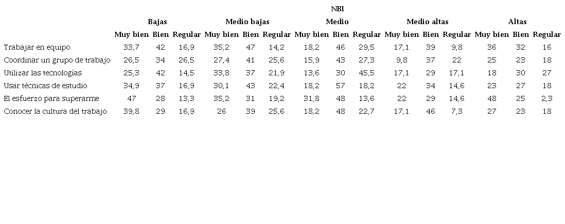 Con estos sentidos, se observa que quienes mayormente consideran que la escuela los prepara para el trabajo en equipo son, en primer lugar, estudiantes que asisten a escuelas ubicadas en NBI altas (36 %); en segundo lugar, los de NBI medio bajas (35,2 %) y en tercer lugar los de NBI bajas (33,7 %). Algo semejante ocurre en relación con la preparación para coordinar un grupo de trabajo, que si bien los porcentajes más altos están en NBI medio bajas (27,4 %) y NBI bajas (26,5 %); luego son los estudiantes que van a escuelas con NBI altas con un porcentaje similar (25 %), quienes piensan que la escuela los forma para ello. Como ya mencionamos, hoy poseer estos saberes es una condición necesaria, pero no suficiente, tanto para la inserción laboral como para pensar en las características de esos puestos laborales. La distribución de la enseñanza de estos tipos de saberes permite la indagación y tener algunas pistas sobre la formación de los sectores más estables del mercado laboral y de sus zonas periféricas.