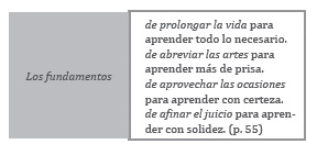 Cualquier idioma, ciencia o arte se enseñe primero por los más sencillos rudimentos para que tenga de ella total idea. Luego, [...] los preceptos y ejemplos. En tercer lugar, el sistema completo con las excepciones. Por último, los comentarios, si hay necesidad. El que se hace cargo del asunto desde el principio no tiene necesidad de comentarios. El mismo, tal vez, pueda comentar poco después. (p. 68)