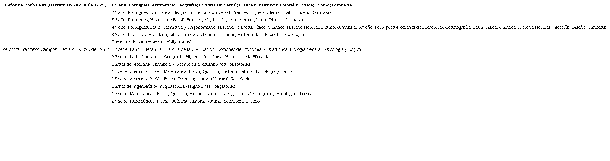 Conviene apuntar que Brasil es un Estado federal y que, hasta finales de la década de 1920, las reformas educacionales solo atendían al sistema de enseñanza del Distrito Federal, más propiamente el Gimnasio Nacional3. Aun así, se presentaban como modelo para otras unidades de la federación, sobre todo porque facultaban a las escuelas estatales a que adoptasen una organización curricular semejante a la posibilidad de someter a sus alumnos a los exámenes de madurez. En caso de que sí fueran aprobados, los jóvenes podrían ingresar en las instituciones de enseñanza superior sin la necesidad de pasar por otras pruebas (Cunha, 2007). Por eso, aunque restringidas a las escuelas de Rio de Janeiro, las reformas educativas federales inspiraban reformas en las unidades de la federación.