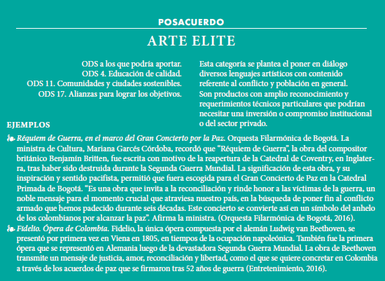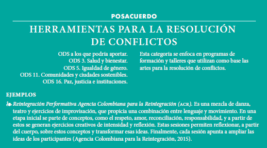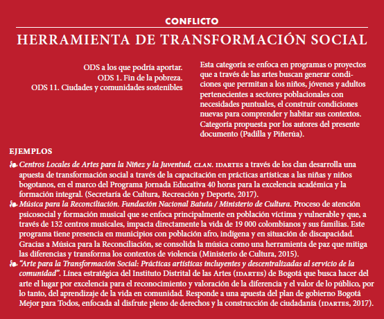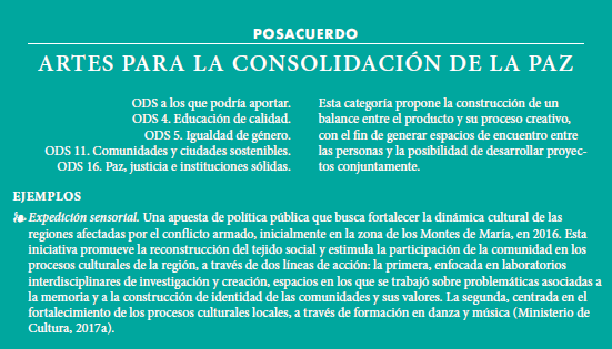 Colombia es un país que ha desarrollado iniciativas enfocadas en la transformación social a través de lenguajes culturales y artísticos ampliamente sistematizadas desde hace más de dos décadas, dichas experiencias son referentes susceptibles de ser capitalizados para la consolidación de iniciativas con enfoque de construcción de paz, más aún al reconocer que es la primera vez que en el programa internacional de desarrollo se hace referencia a la cultura en el marco de los objetivos de desarrollo sostenible (ODS).
