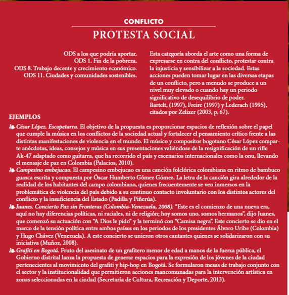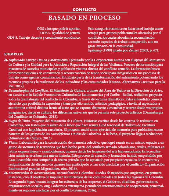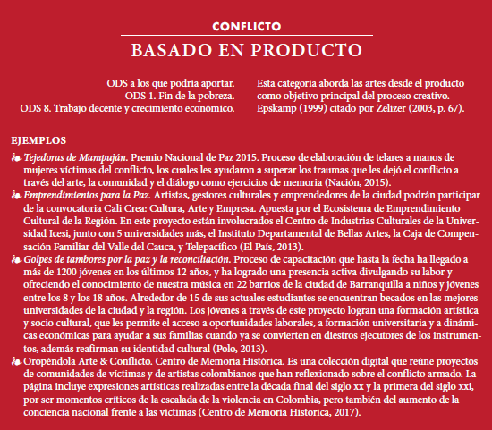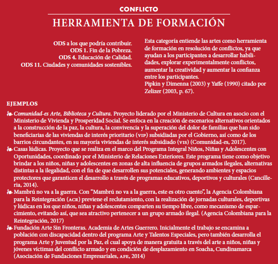 Entendiendo la relación del arte y la cultura con el concepto de desarrollo, y acogiendo el rol decisivo de ambas en procesos de construcción y consolidación de la paz, como mencionan Jaramillo y De la Calle, en Colombia se identifican iniciativas, programas y proyectos culturales y artísticos que podrían categorizarse según la función que cumplen en la consolidación de paz, adaptando los planteamientos de Zerlizer. La categorización propuesta por este autor respecto a la relación de la cultura y el conflicto responde también al momento en que la acción se da; si es durante el conflicto se proponen cinco categorías (herramienta de formación, herramienta de transformación social, arte basado.en producto, arte basado en proceso y protesta social); por otra parte, si la acción se da en el marco de un posacuerdo se reconocen cuatro categorías (artes para la consolidación de la paz, herramientas para la resolución de conflictos, programas a corto plazo y arte élite).