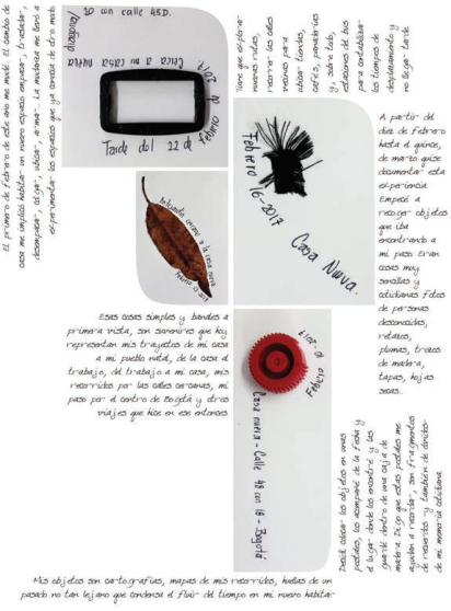 El semillero realizó varios ejercicios de exploración alrededor de la elaboración de cartografías personales a lo largo del primer semestre de 2017, dando cuenta de recorridos y/o experiencias cotidianas con el espacio (particularmente en la cuidad de Bogotá) y las memorias (sobre todo las individuales). Asimismo, varias de estas cartografías son resultado de la participación del grupo en el I Encuentro de Semilleros de Investigación en Educación Artística, realizado en la Universidad Icesi en Cali, entre el 24 y 28 de abril de 2017; allí los integrantes del grupo partimos de la experiencia del viaje y los recorridos realizados en la ciudad. La mayoría de las propuestas se materializaron en libro-objetos que hacen referencia a la memoria del viaje desde la forma de percibir los espacios y señalar la cotidianidad.