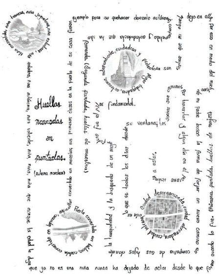 Hasta aquí hemos presentado la perspectiva teórica en torno a algunos conceptos de memoria y espacio, y hemos descrito una apuesta metodológica construida a partir de las implicaciones de hacer mapas cartográficos como formas artísticas y de conocimiento. En este apartado queremos mostrar algunas experiencias cartográficas que hemos desarrollado dentro del semillero Incandescencias. Las imágenes que vienen a continuación dan cuenta de distintos ejercicios cartográficos hechos por los y las integrantes del semillero. Desde la combinación de lo visual con lo narrativo, más allá de ser imágenes ilustrativas, presentamos nuestros mapas como resultado investigativo y creativo.