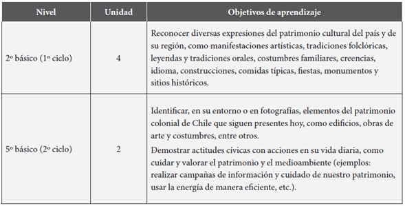 Específicamente, en el caso de la asignatura de Historia es posible una relación explícita o implícita para abordar temáticas relacionadas con patrimonio arquitectónico local a partir de sus objetivos de aprendizajes y el desarrollo de las prácticas pedagógicas asociadas al cuidado y fomento del patrimonio en el aula, constituyéndose en un desafío para todos los actores involucrados en la tarea formativa (véase la tabla 1). Las oportunidades educativas que brinda el ámbito escolar se convierten en un colaborador estratégico clave para alcanzar los propósitos planteados por el currículo, favoreciendo la incorporación de distintas temáticas interdisciplinarias.